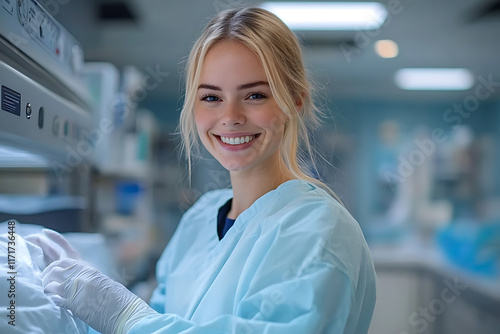 Caring and professional nurse assisting a patient in a modern clinic, wearing a medical uniform, showcasing compassion and expertise in a clean and professional healthcare environment.