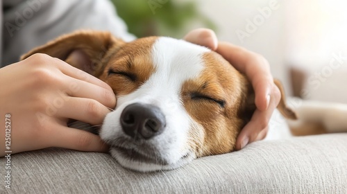 Caring pet owner gently pampering a relaxed dog enjoying affection and comfort at home : Generative AI