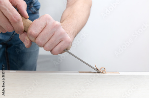 Carpenter chooses a groove in the door for awnings. Work with a chisel on wood.