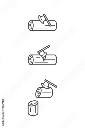 Carpenter equipment tool set step of chopping timber by axe symbol icon concept idea outline stroke design illustration black and white color isolated on white background, vector eps10