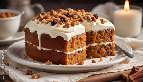 Carrot cake with vanilla filling, vanilla icing and crushed nuts and blueberries
