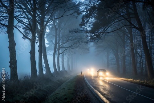 Cars driving through foggy forest road with headlights illuminating the mysterious path at night