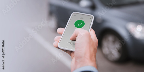carsharing, transportation and technology concept - close up of hand with on smartphone screen over car on background