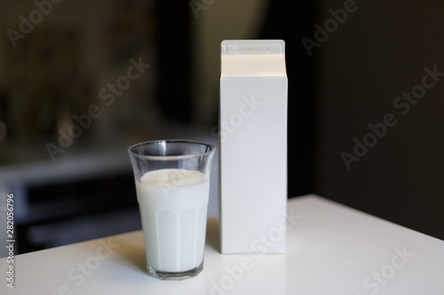 Carton box and glass of milk on table in kitchen