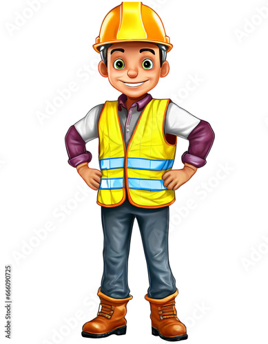 Cartoon 3D Render Construction Worker full body wearing helmet Hyper Detail on white background. isolated