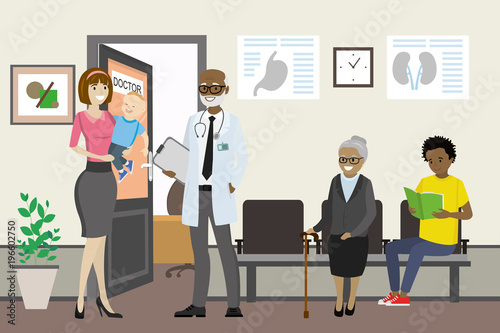 Cartoon african american doctor talking to a caucasian female