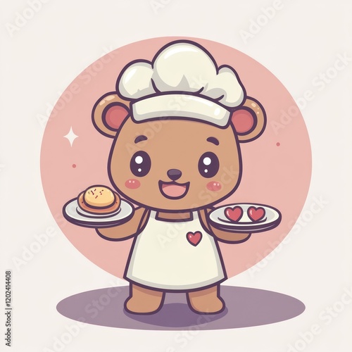 Cartoon bear baker holding plates with cookies in pink background, for children's content