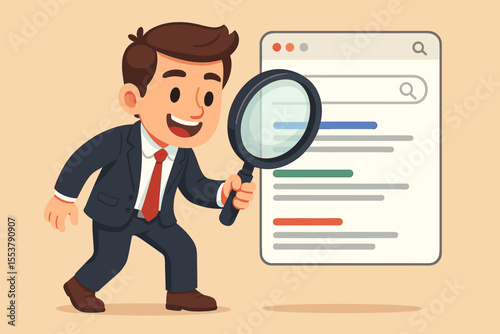 Cartoon businessman in suit holding magnifying glass analyzing search engine results. SEO research, online marketing, data analysis, digital strategy, web search concept vector illustration