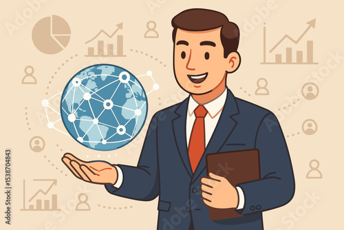 Cartoon businessman presents global business network. Manager with globe and data analytics charts. Concept for corporate strategy, international communication, and market growth. Vector.