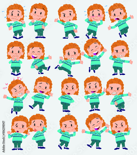 Cartoon character white girl with sweater. Set with different postures, attitudes and poses, doing different activities in isolated vector illustrations.