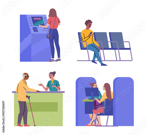 Cartoon Color Different Types Characters Clients and Managers at Bank Office Room Concept Flat Design Style. Vector illustration
