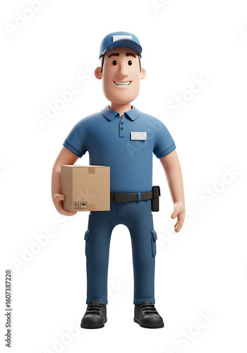 Cartoon delivery person holding a cardboard box, smiling and standing in uniform.