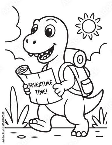 Cartoon dinosaur with backpack reading adventure time map