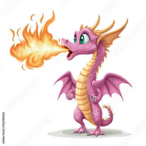 Cartoon Dragon Breathing Fire with a Pink and Golden Coloration. Mythology and Fantasy Concept