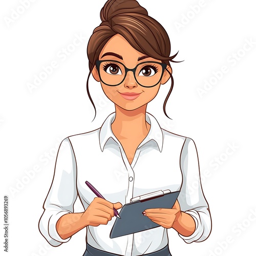 Cartoon employee holding a pen and taking notes, looking professional on a white background.