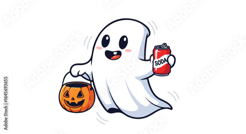 Cartoon ghost carrying a pumpkin bucket and a soda can, smiling with a happy expression.