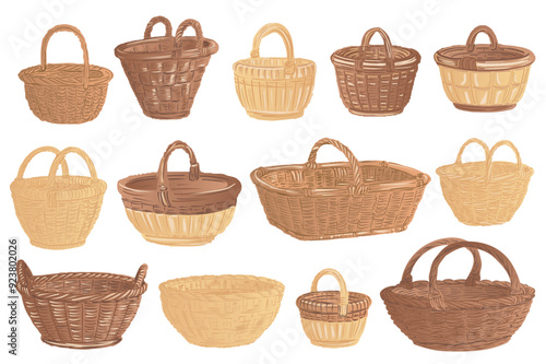 Cartoon handmade baskets mega set elements in flat graphic design. Bundle objects of brown wicker rattan containers with handles, handcraft straw hampers, braided rural basketry. Vector illustration.