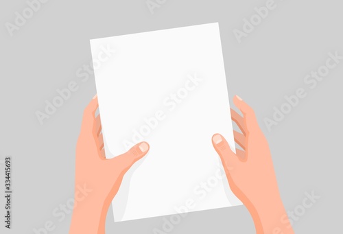 Cartoon human hands hold clear paper sheet template vector graphic illustration. Colored male arms with white empty blank page document isolated on gray background. Concept of advertisement design