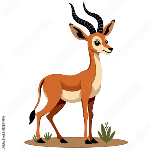 Cartoon Illustration of a Graceful Gazelle Standing on the Ground with Black Horns and Brown Fur