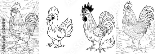 Cartoon illustration of a rooster character as a coloring page isolated image