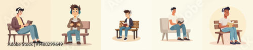 Cartoon Illustration of a Young Man Relaxing on a Park Bench While Reading a Book and Listening to Music