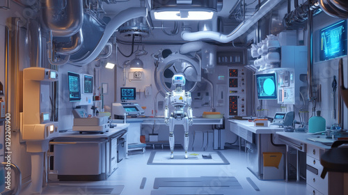 Cartoon lab technology interior vector background. Laboratory robot equipment for medical and science experiment. Futuristic dog transformer biotech modification. Ventilation and pipes in room
