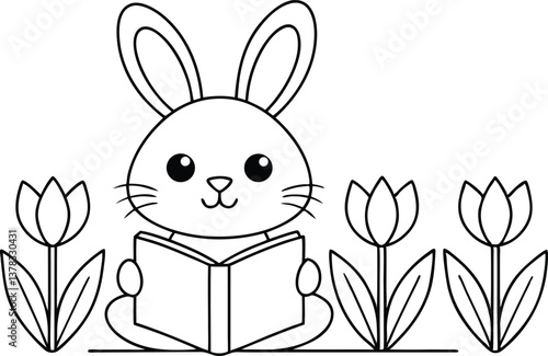 Cartoon Rabbit Reading a Book with Tulips, Black and White Line Art on Transparent