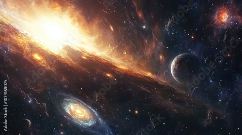 Cartoon rendering in 3D of galaxies and nebulae in outer space
