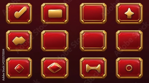 Cartoon set of medieval game buttons animation set. Vector illustration of red bars with golden frames. Play, start, shop, resume, restart, login, settings, cancel, option, continue sprite sheet