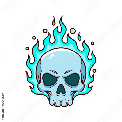 Cartoon Skull Engulfed in Cyan Flames with Dark Eye Sockets and Defined Teeth
