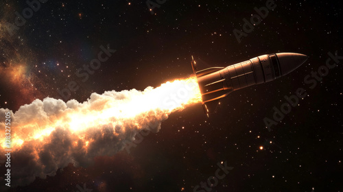Cartoon spacecraft launch into outer space. Vector illustration of rocket or alien UFO starting from planet surface with fire trail and clouds of white smoke. Cosmic vehicle flying in dark starry sky