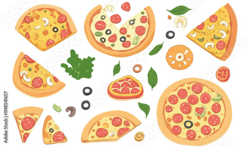 Cartoon Style Hand Drawn Pizza Set with Ingredients and Toppings Vector Illustration