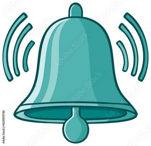Cartoon teal bell ringing with sound waves, symbolizing alert and notification