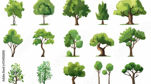 Cartoon trees set isolated on a white background. Simple modern style. Cute green plants, forest,