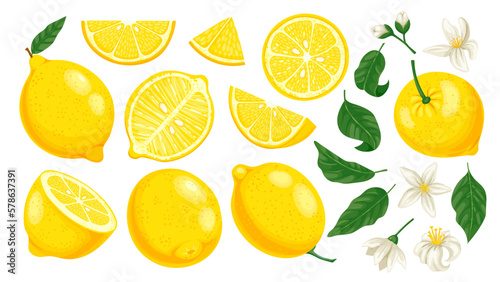 Cartoon yellow lemon. Fresh citrus slices and leaves and blossom. Lemonade fruit cartoon isolated vector illustration set. Whole, half and piece of lemon, tasty juicy and organic product