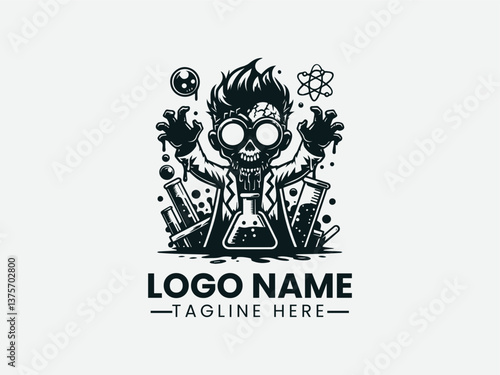 Cartoon Zombie Scientist Glowing Eyes Laboratory Vector Logo Design, Spooky Zombie Scientist Laboratory Logo