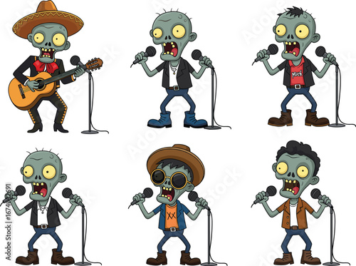 Cartoon zombie singers set, undead musicians performing with microphones and guitar, colorful zombie characters in various outfits, Halloween music illustration collection