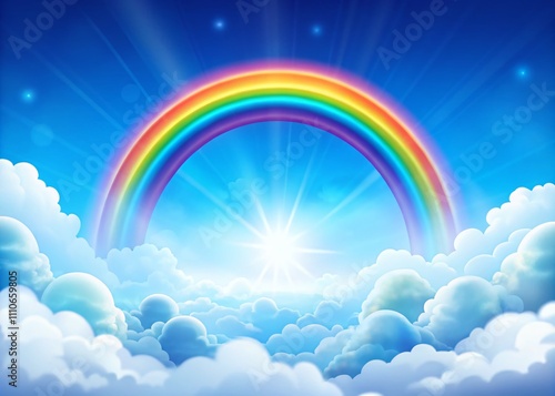 Cartoon-Style Background Featuring Fluffy White Clouds and a Bright Rainbow in a Clear Blue Sky for Magical Design Projects