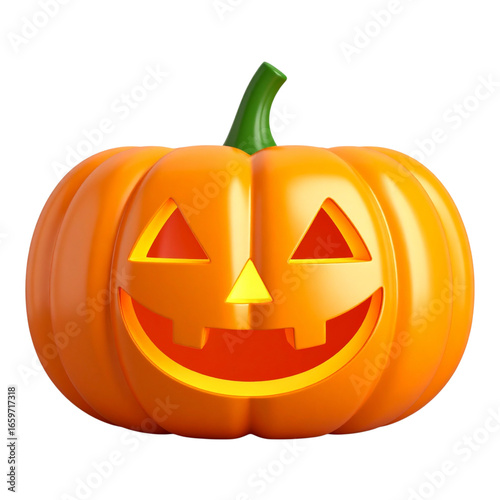 Carved pumpkin with a smiling face, illuminated from within, against a white background.