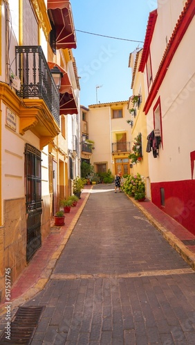 Casco antiguo y coloridas casas en calles estrechas de la población de Polop de la Marina en Alicante junto a Benidorm.