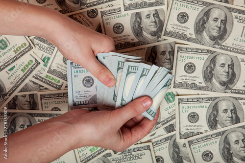 Cash in hand. Profit, savings. Stack of dollars. a person who is counting money against the background of money, success, motivation, financial flows, wealth. Buy dollars, dollars manually