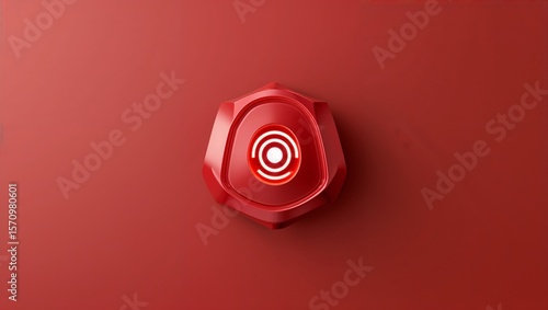 Casting soft shadow, red hexagonal device resting on studio surface, with illuminated target symbol