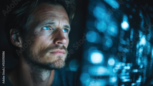 Casual IT specialist with abstract tech background, symbolizing innovation in modern workspaces
