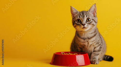 Cat and food bowl on clean background with space for text or graphic design.