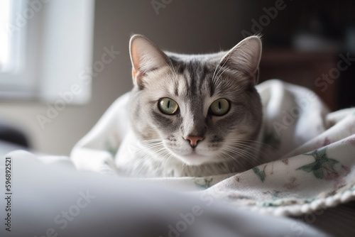 cat at home on the sofa, cat under blanket. Generative AI