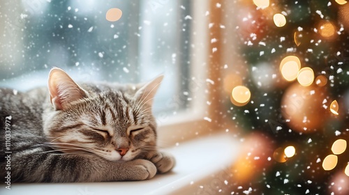 "Cat Curled Up on a Window Sill, Watching the Snowfall"