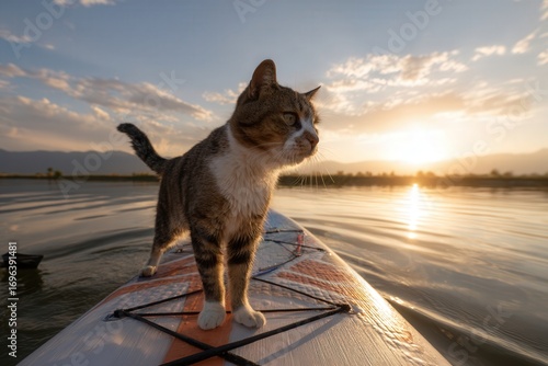 Cat enjoys sunset paddleboarding on tranquil lake amidst scenic mountain backdrop and soft flowing water