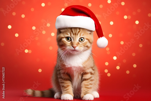 Cat in Santa Hats, Isolated on a Festive Red Background.