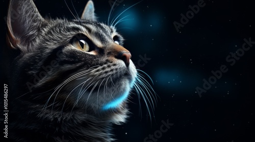 Cat muzzle in cosmic atmosphere in dark colors with stars. Neural network ai generated art