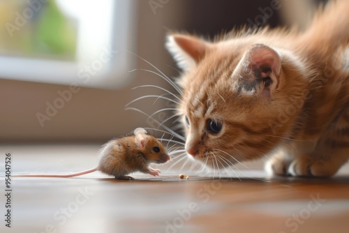 Cat Playing: Kitten Chasing Little Mouse on Table in Cute, Playful Hunt